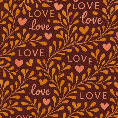 Radiating with romantic charm, this design pairs the richness of a deep reddish-brown background with vibrant orange and rosy pink lettering. The repeated word ?LOVE? unfurls in a mix of bold and flowing fonts, surrounded by whimsical heart shapes and leafy, curling vines. These natural elements weave through the pattern like tender emotions growing wild and free. Perfect for wrapping paper, statement apparel, or decorative prints, this design captures a heartfelt mood that?s both cozy and expressive.