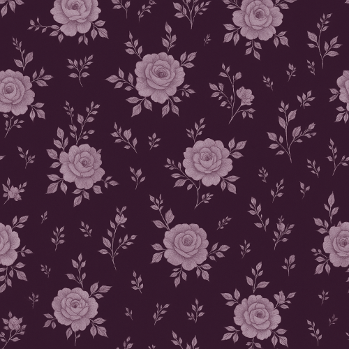 A romantic scatter of soft lavender roses and leafy sprigs unfolds across a rich plum background. Each bloom features finely layered petals and delicately clustered foliage, creating a sense of depth and grace. The tonal harmony between the light florals and deep base evokes dusk garden elegance?perfect for refined wrapping papers, stationery, or branding that seeks to blend classic floral charm with a modern, moody palette.
