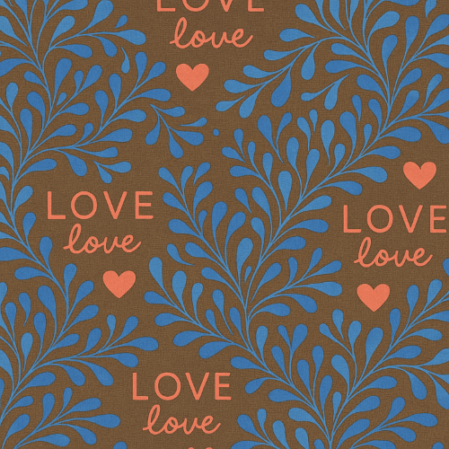 This cozy pattern melds earthy tones with heartfelt motifs. Set against a rich brown backdrop, graceful blue leafy branches sweep across the surface, bringing a sense of calm and natural flow. The word ?LOVE? stands out in bold orange, alternating between uppercase and cursive, accompanied by softly glowing orange hearts. Together, the elements create a feeling of warmth and quiet affection?perfect for stationery, fabric prints, or seasonal dcor that speaks of love growing gently over time.