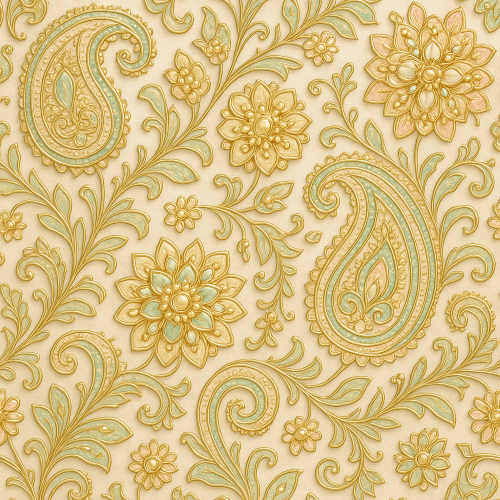 Rich?tradition?meets?modern?elegance?in?this?intricate?pattern?featuring?stylized?florals?and?swirling?paisley?motifs.?Accents?of?gold?intertwine?with?soft?blue?hues?across?a?smooth?beige?canvas,?creating?a?regal?and?artistic?impression.?Ornate?vines?and?leaf?flourishes?bridge?each?element,?forming?a?seamless?design?that?s?both?graceful?and?commanding.