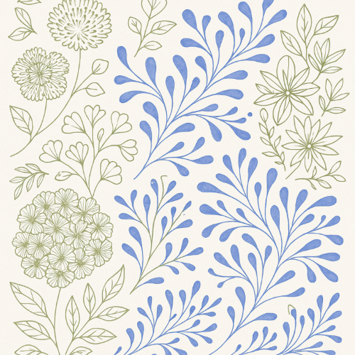A harmonious blend of fine-lined florals in soft green and sweeping abstract foliage in indigo blue, arranged in a scattered yet intentional rhythm. The contrast between detailed botanical renderings and painterly blue leaf forms adds visual depth and artistic charm. Set against a warm, neutral backdrop, the pattern evokes a hand-illustrated field guide with a modern twist?ideal for refined stationery, nature-themed packaging, or branding that values craftsmanship and calm.