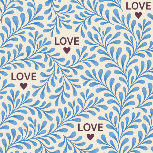 This elegant pattern intertwines nature and affection with subtle grace. Soft blue leafy branches stretch across a light canvas, forming a gentle, flowing rhythm. Sprinkled throughout are bold, dark red ?LOVE? block letters and petite heart icons, creating a poetic contrast between organic forms and graphic symbols. The palette exudes serenity, while the message resonates with warmth?making this design ideal for romantic stationery, cozy home decor, or tender-themed apparel.