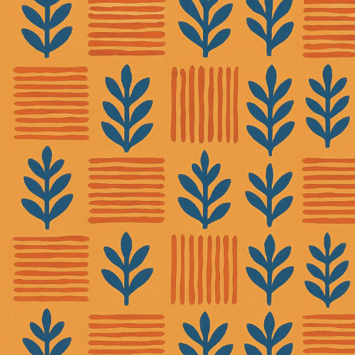 A striking lattice of blue leaf clusters sits at the intersections of linear orange pathways, forming a rhythmic grid against a zesty orange backdrop. The interplay of cool indigo and warm citrus hues creates a vibrant visual tension, while the precise alignment of elements adds a retro-modern flair. Ideal for bold packaging concepts, statement stationery, or branding that leans into playful symmetry and strong color storytelling.