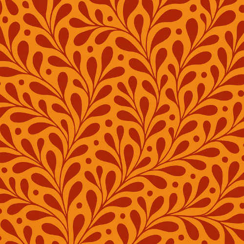 This pattern bursts with the warmth and rhythm of fall. Deep crimson leaves unfurl across a vivid orange backdrop, creating a rich tapestry of movement and natural elegance. The symmetrical, swirling motifs suggest fluttering foliage caught in a gentle autumn breeze. With its bold contrast and organic flow, this seamless design evokes feelings of coziness, seasonal change, and timeless beauty?perfect for textiles, gift wraps, or striking interior accents.