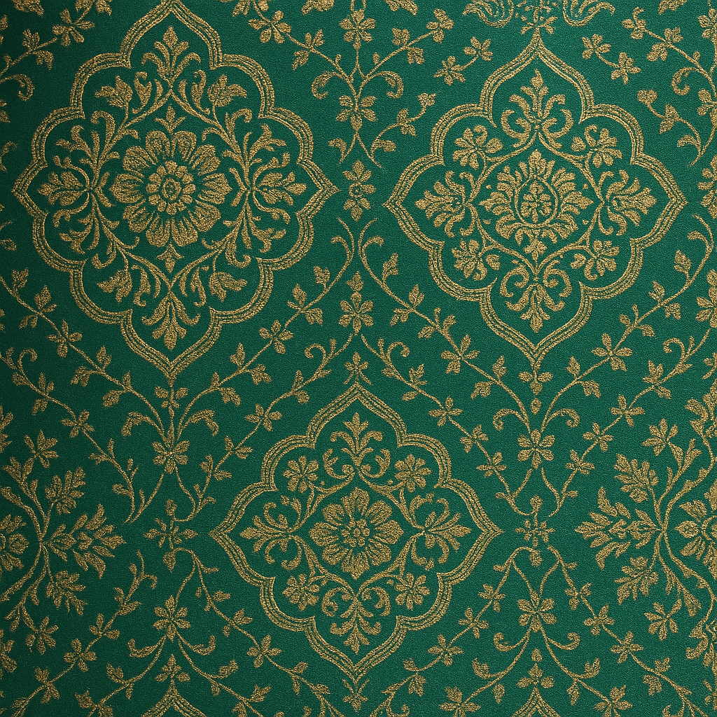 A seamless blend of tradition and beauty, this pattern showcases?gold-thread floral medallions?intricately arranged on a?vibrant emerald green backdrop. The symmetrical composition and ornate vine work make this design ideal for?festive textiles, sarees, brocades, wallpapers, or invitation backgrounds. It?s a graceful tribute to timeless Indian aesthetics.