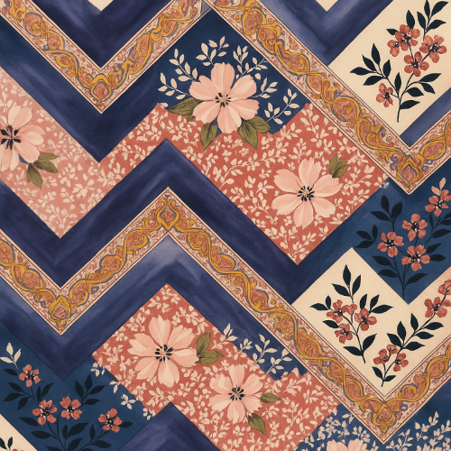 This ornate pattern blooms with elegance and dynamism. Bold zigzag bands in vivid pink and calming blue set a rhythmic foundation, while lush pink florals with green and black leaves cascade gracefully across the canvas. Intricately detailed yellow and pink paisley borders enrich the composition with an ethnic charm and ornamental flair. The overall effect is both energetic and refined?ideal for festive apparel, luxurious drapery, or statement surface designs that marry tradition with a modern twist.