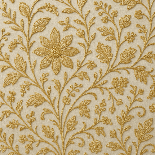 Capture the beauty of a wild meadow with this?charming beige and gold floral embroidery. The gentle, naturalistic design evokes hand-stitched craftsmanship, ideal for?wedding textiles, ethnic wear, soft furnishings, or eco-inspired design themes. A warm, inviting pattern that balances elegance and earthiness.