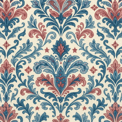 An elegant spread of stylized florals and grand foliage in deep indigo, ruby red, and soft peach flows symmetrically across a light beige ground. Each element?curved leaves, layered petals, and vine flourishes?is meticulously detailed, creating a sense of harmony and regal sophistication. The palette balances cool and warm tones, offering versatility for festive packaging, premium paper goods, or branding that blends vintage richness with polished refinement.