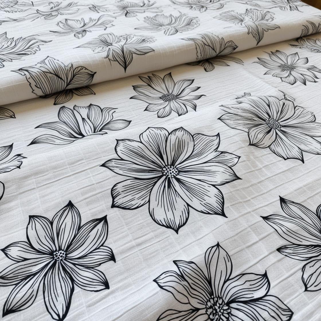 A crisp white canvas brought to life with black-outlined florals arranged in a balanced, all-over layout. Each bloom features expressive petal details and confident linework, creating a striking contrast that blends elegance with graphic simplicity. Ideal for contemporary gift wrapping, bold stationery, or modern branding projects that lean into clarity and visual impact.