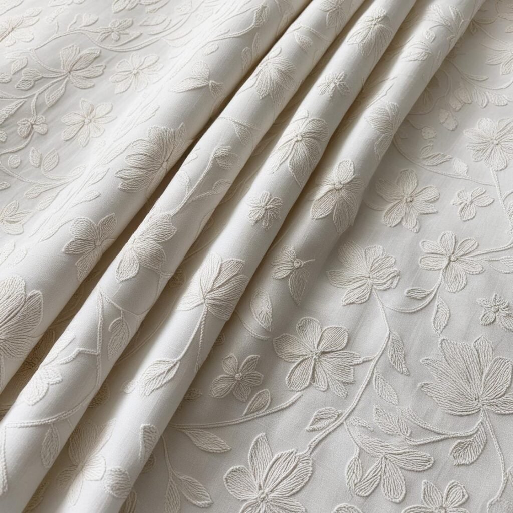 A delicate expanse of floral embroidery crafted in matching ivory threads on a soft, neutral fabric. The intricate stitching showcases petals, leaves, and natural curvatures in a tone-on-tone palette, creating a textured yet understated elegance. Ideal for luxury packaging linings, haute couture accents, or premium branding projects that embrace tactile beauty and quiet sophistication.