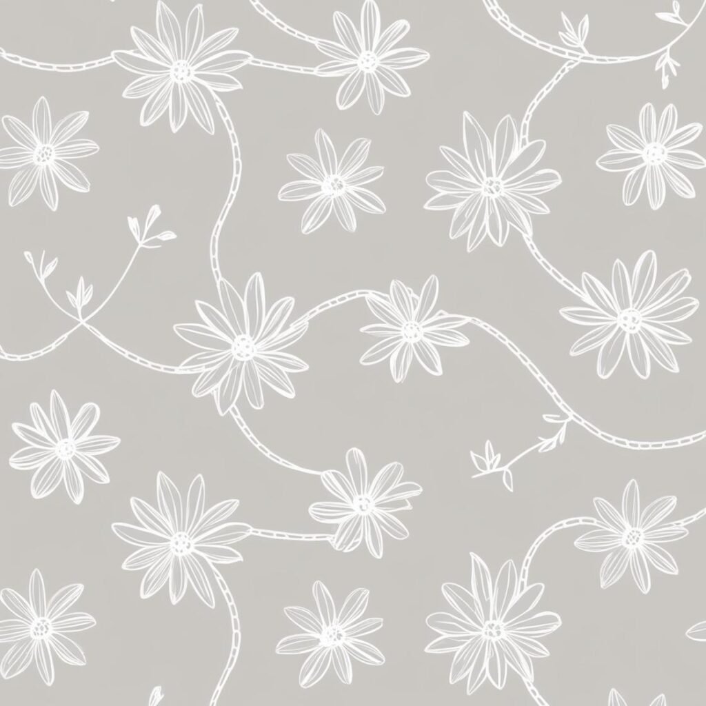 A graceful composition of white, hand-illustrated florals linked by soft, meandering vines over a muted gray canvas. This seamless pattern exudes a sense of serenity and refined elegance?ideal for upscale gift packaging, fabric prints, or minimalist brand accents. Its monochrome palette and flowing forms make it both timeless and versatile.