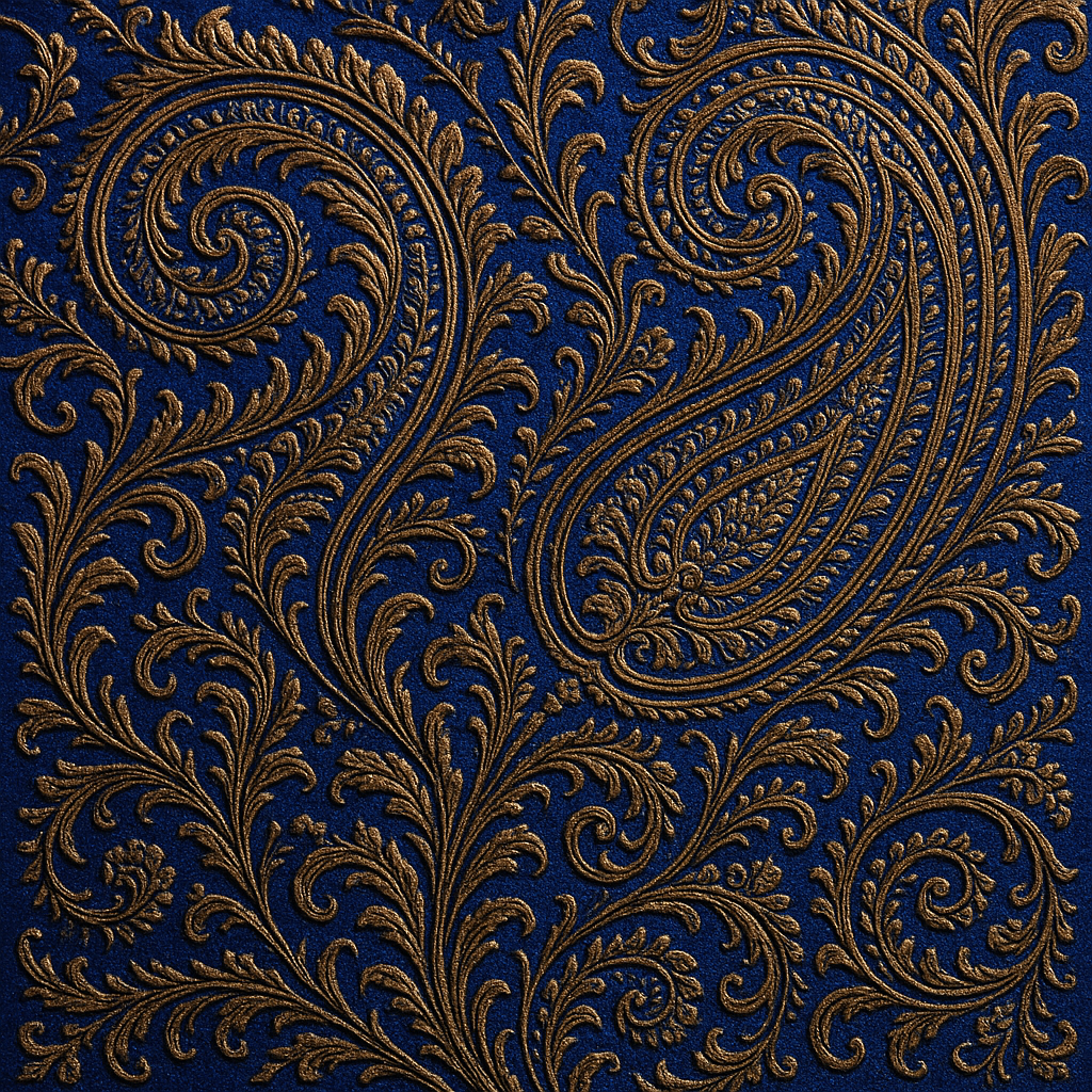 This regal paisley-inspired pattern features?ornate gold embroidery?woven over a?deep blue canvas, exuding richness and elegance. The detailed swirling vines and floral touches offer a nod to traditional Indian and Persian textiles. Perfect for?formal upholstery, wall coverings, high-end fashion, or digital decor, this design adds a luxurious and classic appeal to any project.