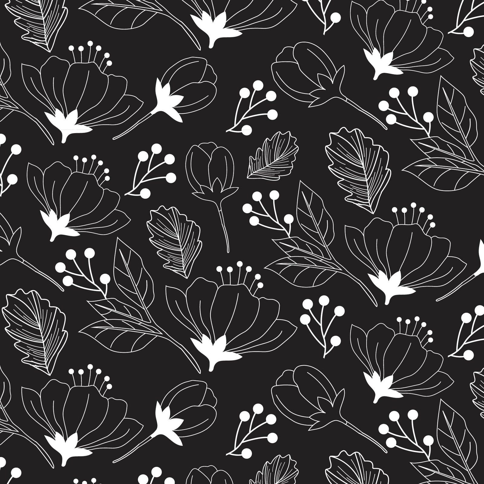 A graceful tangle of white florals and foliage unfurls across a deep black backdrop, featuring large blooms, delicate leaves, berry clusters, and swirling strokes. The bold monochrome contrast and sweeping, organic composition evoke the movement of moonlit vines in the night breeze. Ideal for premium packaging, decorative papers, or branding that embraces drama with elegant fluidity.