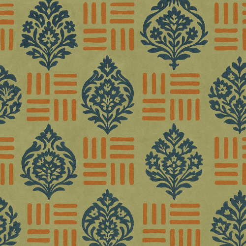 Bold damask-style florals in rich indigo bloom across a muted olive-green background, anchored at regular intervals by crisp orange gridlines. The interplay of ornate curves and geometric order creates a dynamic visual rhythm, while the complementary palette adds vibrancy without overpowering. This pattern strikes a balance between classical elegance and modern boldness?ideal for heritage-inspired packaging, upscale gift wraps, or branding that values structured beauty with a twist of color contrast.