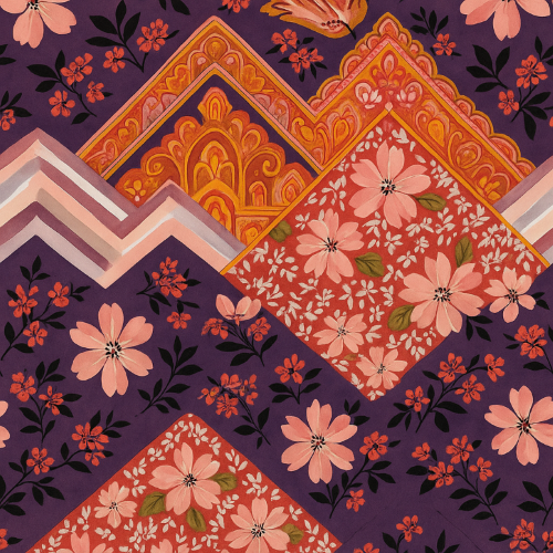 A lavish dance of petals and patterns unfolds across this vibrant tapestry. Set against a regal purple canvas, blooming florals in shades of pink and orange are intertwined with lush green leaves. Ornamental zigzags and chevron motifs in lavender, white, and blush flow between the blossoms, giving the design both rhythm and richness. Hints of gold and amber filigree whisper of tradition and opulence, while the symmetrical layout anchors the visual feast in elegant geometry. Ideal for ethnic-inspired textiles, luxe home decor, or statement fashion pieces.