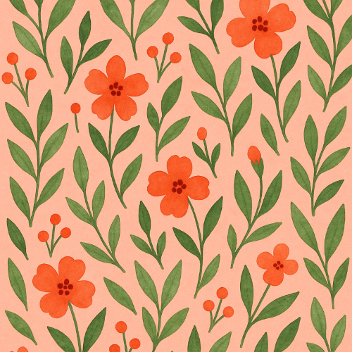 A soft scattering of apricot-orange flowers with delicate five-petal forms, nestled among slender green leaves and subtle stems, all resting on a warm peach background. The composition feels airy and organic, with just enough variation in bloom and foliage to add rhythm without crowding. Ideal for springtime gift wraps, garden-themed paper goods, or branding that channels warmth, delicacy, and an artisanal touch.