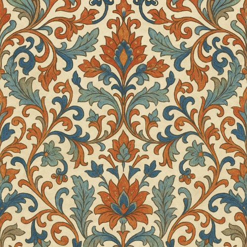 An ornate floral medallion design featuring stylized petals, vine scrolls, and layered botanical motifs in rich saffron orange, cobalt blue, and olive green. Set against a soft beige ground, the symmetrical layout evokes hand-embroidered textiles and heritage tapestries. Each mirrored unit adds depth and harmony, making it ideal for artisan gift wraps, bespoke fabric prints, or branding with a refined folk aesthetic.