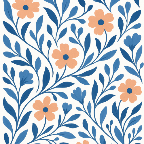 Radiant tangerine flowers with bold five-petal forms bloom along sweeping indigo stems, accented by elongated blue leaves. Set against a crisp white backdrop, the interplay of warm and cool hues creates striking visual harmony. The flowing vine-like structure adds rhythm and elegance?making it ideal for modern botanical gift wraps, creative packaging, or branding that thrives on vibrant simplicity and organic energy.