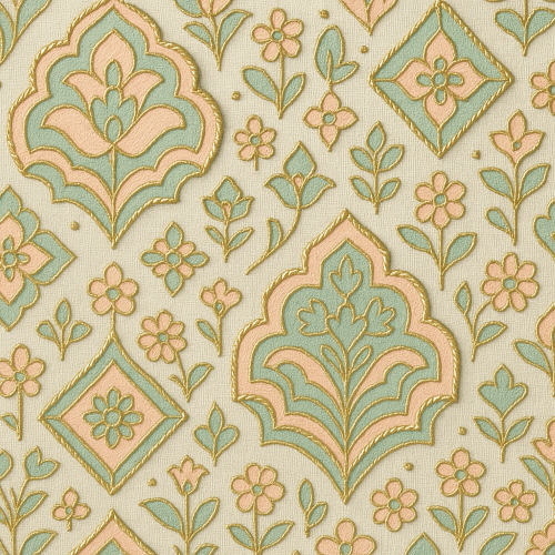 Delicacy?and?symmetry?unite?in?this?stunning?decorative?design,?where?soft?pink?and?green?florals?bloom?alongside?gold-outlined?diamond?shapes?on?a?beige?canvas.?The?interplay?of?botanical?motifs?with?structured?geometry?gives?this?pattern?a?timeless?charm.?Gold?embroidery?enhances?each?detail?with?a?luminous?touch,?making?the?composition?ideal?for?luxurious?surfaces?and?creative?expressions.