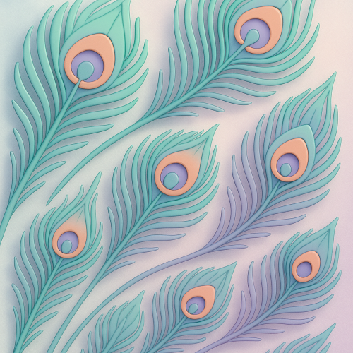 This?graceful?design?showcases?a?cluster?of?peacock?feathers?rendered?in?rich?teal?and?green?shades?with?delicate?touches?of?peach?and?purple.?Each?feather?features?the?iconic??eye??motif,?subtly?shaded?for?depth?and?elegance.?The?soft?gradient?backdrop?enhances?the?artistic?detailing,?making?the?composition?feel?both?luxurious?and?serene.