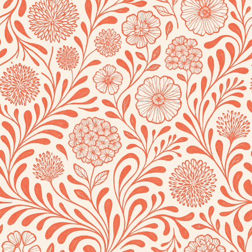A soft bouquet of stylized blossoms in terracotta red, warm rose, and subtle orange hues, gracefully scattered across a muted peach-beige canvas. Each bloom features layered petals and curved leaves, creating gentle movement and visual harmony. The design exudes an artisanal, sun-kissed feel?ideal for rustic gift wraps, cozy packaging, or branding that blends handmade charm with understated elegance.