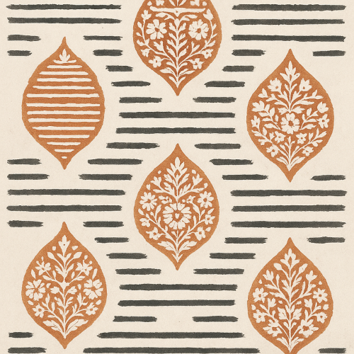 Stylized teardrop-shaped motifs in warm terracotta tones?each filled with delicate white floral filigree?stand in rhythmic rows across a field of deep burnt orange. Between them, staggered black dashes form understated stripes, lending movement and structure to the composition. The blend of intricate ornamentation with a graphic, grounded layout gives it a refined yet tribal-inspired appeal?ideal for statement packaging, earthy-themed wraps, or branding that balances handcrafted softness with rhythmic precision.