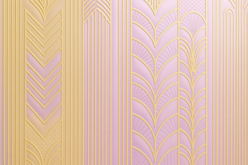 Infused?with?refined?charm,?this?decorative?pattern?showcases?a?harmonious?blend?of?geometric?shapes?and?traditional?fan?motifs,?embossed?in?shimmering?gold?against?a?rich?pink?canvas.?Hexagons,?chevrons,?scallops,?and?fan-like?silhouettes?form?a?symmetrical?tapestry,?enhanced?by?raised?textures?that?invite?both?visual?and?tactile?delight.?The?contrast?between?the?matte?pink?and?radiant?gold?adds?a?contemporary?twist?to?classic?design?language.