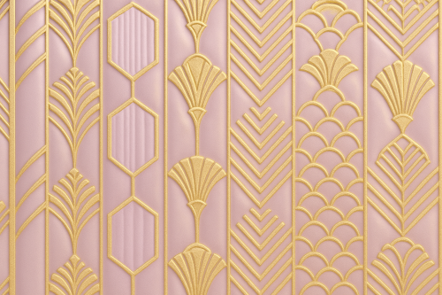 Infused?with?refined?charm,?this?decorative?pattern?showcases?a?harmonious?blend?of?geometric?shapes?and?traditional?fan?motifs,?embossed?in?shimmering?gold?against?a?rich?pink?canvas.?Hexagons,?chevrons,?scallops,?and?fan-like?silhouettes?form?a?symmetrical?tapestry,?enhanced?by?raised?textures?that?invite?both?visual?and?tactile?delight.?The?contrast?between?the?matte?pink?and?radiant?gold?adds?a?contemporary?twist?to?classic?design?language.