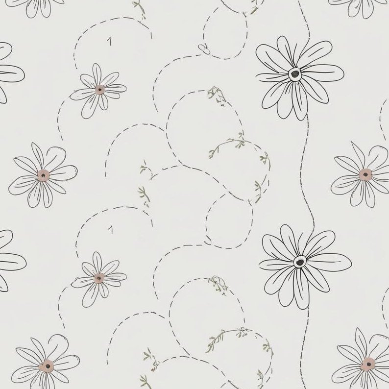 A spirited pattern featuring bold black-outlined florals with stitched loops and interspersed mint green sprigs. The lively dotted pathways dance across the soft backdrop, lending the design a sense of cheerful motion. Occasional numeric elements add an unexpected twist, making it perfect for creative packaging, playful stationery, or designs with a modern handcrafted flair.